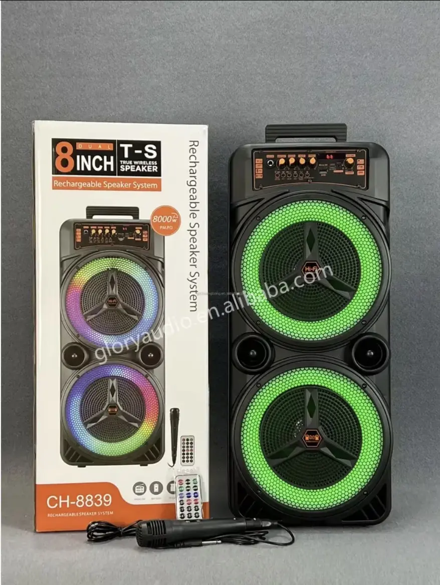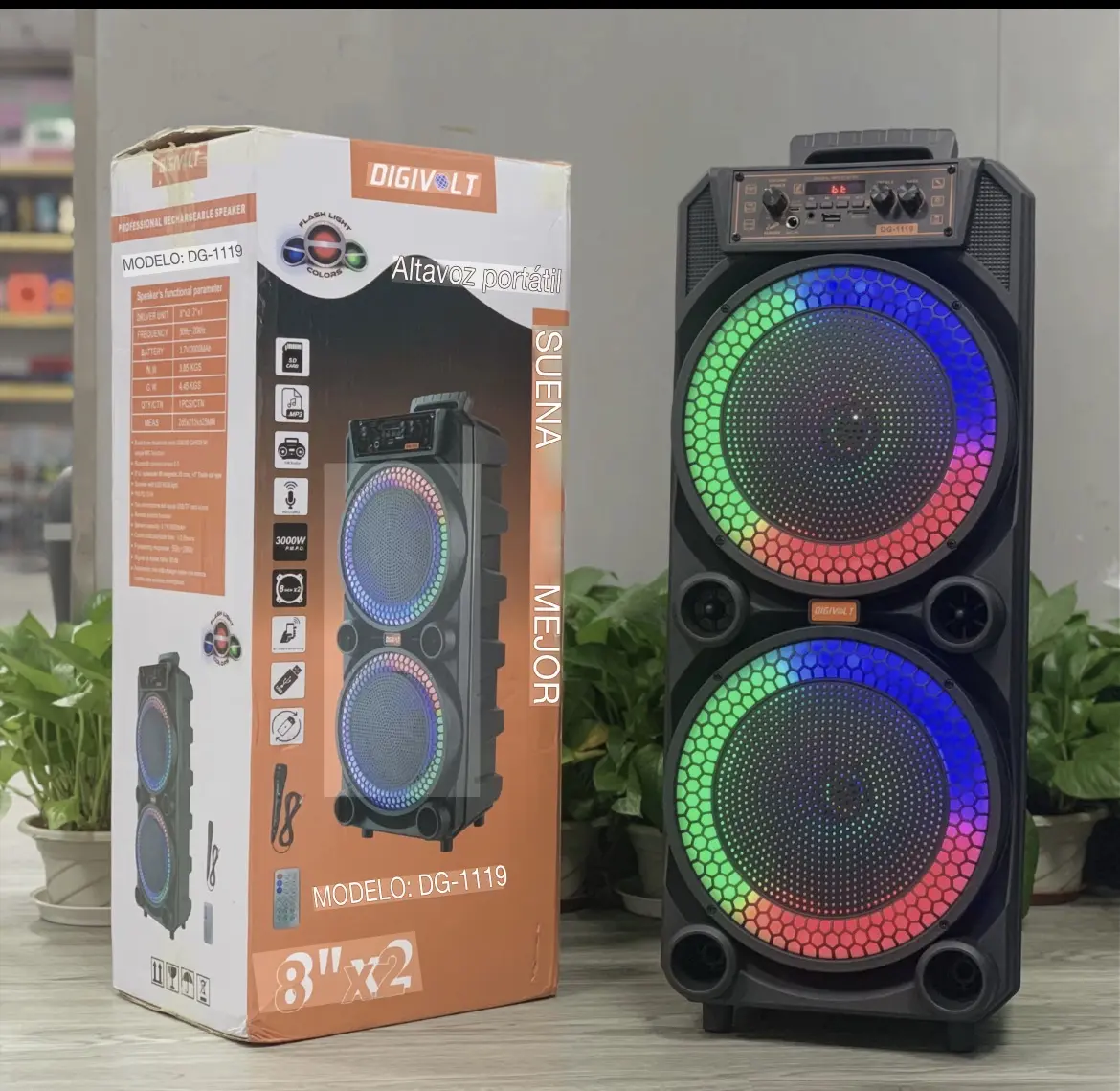 Con su configuración de doble parlante de 8", ofrece graves profundos y una potencia de salida de 3000W PMPO, asegurando que la música se escuche con claridad en espacios amplios. Es el equipo más buscado para reuniones familiares, picnics y eventos sociales.